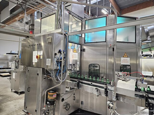 Resumen Este llenador y cerrador isobárico fue fabricado en 1998 por la empresa italiana Cortellazzi (SACMI). La máquina está en condiciones operativas, ha sido mantenida regularmente por el operador y se ha utilizado principalmente para agua. Se vende con formatos y repuestos incluidos. Datos técnicos Capacidad: 12.000 botellas/h (operado a ~10.000 botellas/h) Formatos: botellas PET de 0,5 L, 1,0 L, 1,5 L Sistema de llenado: isobárico, 50 válvulas de llenado Enjuagador: 50 estaciones de enjuague Cerrador: 10 cabezales Productos: agua, agua aromatizada, CSD (pequeña proporción) Control: Siemens S7 Características adicionales: lubricación centralizada, piezas de formato, repuestos.
